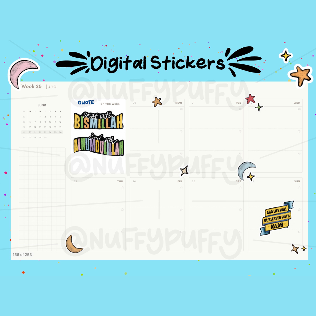 This Islamic Digital Sticker Sheet includes faith-based reminders such as “InshaAllah,” “Alhamdulillah,” and more—perfect for Ramadan planning or everyday spiritual reflection. Compatible with Goodnotes and most digital planner apps, these stickers add a gentle, meaningful touch to your daily pages.